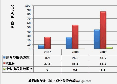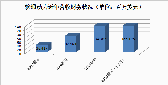 軟通動力的收入從2007年的3642萬美元大幅增長到2009年的34億美元,年復合增長率為92.15%。2010財年前九個月,軟通動力的收入達到1.35億美元,超過了2009年全年的收入。