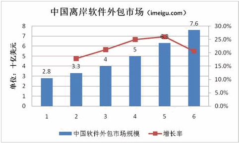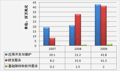 中國IT服務企業(yè)承擔的離岸IT服務項目主要是軟件外包。這些業(yè)務包括應用程序開發(fā)和管理、產品開發(fā)、包裝解決方案服務、全球化和本地化服務等。這些客戶包括外國公司和外國公司在中國的分支機構/子公司。中國的離岸軟件外包市場近年來也發(fā)展迅速。根據IDC 2010年7月的報告,中國離岸軟件市場規(guī)模將從2009年的28億美元增長到2014年的76億美元,年復合增長率為22.4%。