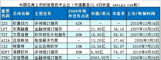 目前,軟通動力等多家中國信息技術公司已在美國上市。以下是各大公司的主營業(yè)務、上市時間及市值、市盈率等。