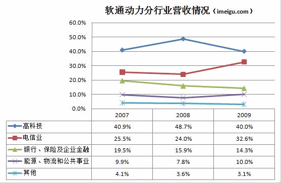 這些行業(yè)中,高科技行業(yè)占比最大,主要來自微軟、IBM等大型企業(yè)集團的軟件分包項目;這些客戶也是軟通動力最賺錢的客戶。2007年、2008年和2009年,來自高新技術產業(yè)的收入占軟通動力總收入的40%以上。