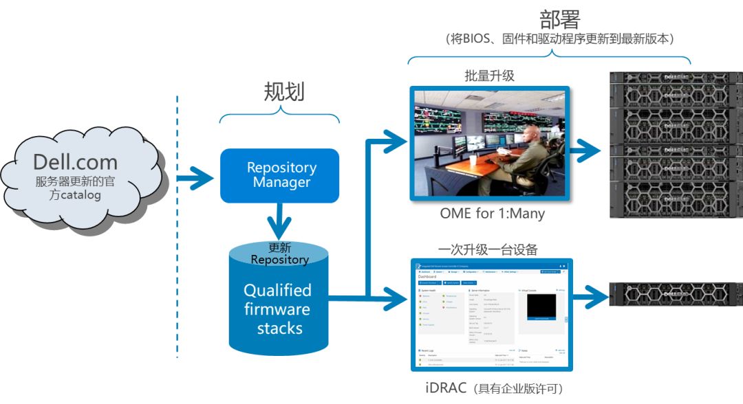 建議使用 Dell (DRM) 創(chuàng)建存儲庫并將 iDRAC 配置為使用此存儲庫檢查和執(zhí)行固件更新。通過內(nèi)部存儲庫,用戶可以控制 iDRAC 的可用固件和版本,有助于避免任何意外的固件更改,而 OME 控制臺支持批量固件升級。