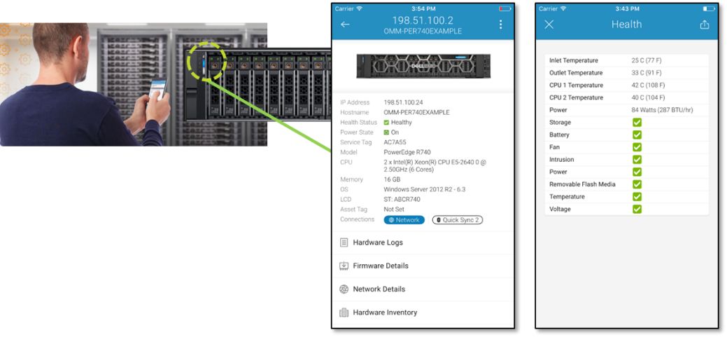 除了PC端的管理和監(jiān)控,用戶還可以在iOS手機/平板上下載安裝OMM( ) APP,與服務(wù)器建立BLE/Wi-Fi連接后,即可輕松查看服務(wù)器庫存,健康狀態(tài)和日志,甚至重新啟動服務(wù)器(需要帶有 Quick Sync 2 模塊的可選面板)。