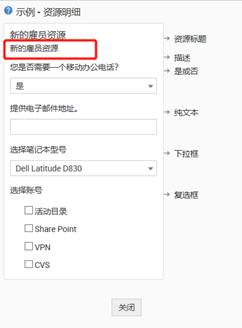 向服務(wù)請(qǐng)求模板添加“資源”,以縮小用戶的需求范圍,避免不必要的電子郵件來(lái)回。“資源”是一組問(wèn)題,可幫助技術(shù)人員了解服務(wù)請(qǐng)求者的確切需求。以下是服務(wù)請(qǐng)求的示例資源部分,