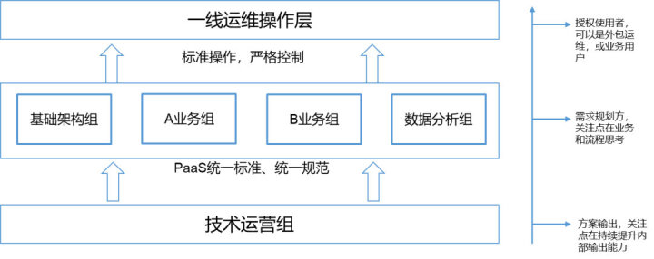 從基于PaaS的運(yùn)維技術(shù)架構(gòu)的變化趨勢(shì)來看,如果把運(yùn)維組織看成是一種技術(shù)架構(gòu),應(yīng)該有一個(gè)“運(yùn)維引擎型組織”來輸出運(yùn)維解決方案到外面的世界。在基于PaaS的技術(shù)運(yùn)營體系下,這個(gè)組織稱為技術(shù)運(yùn)營組。