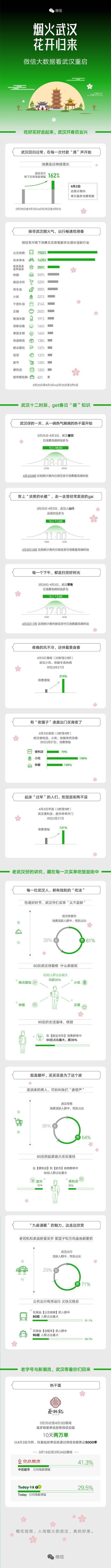 從微信支付發(fā)布的大數(shù)據(jù)來(lái)看,武漢市民生活必需品的方方面面已經(jīng)逐漸恢復(fù)。從3月25日武漢重啟公交起,清明節(jié)前,微信平臺(tái)線下交易量較上月同期增長(zhǎng)162%。各行業(yè)中,公交、地鐵交易量增長(zhǎng)近15倍,兩江四岸重拾昔日活力。