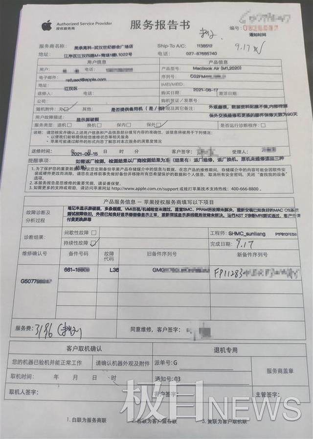 “本以為國際知名品牌的產品很靠譜,沒想到用了一個月就成了‘定時炸彈’!” 9月18日,站在美成高科武漢世紀都市廣場店的維修柜臺前,齊女士怒不可遏。面對這位蘋果指定維修商,雖然她極力解釋,但店家始終堅稱其送修的蘋果M1處理器Air筆記本的屏幕裂痕是人為造成的,而且維修費更貴。超過3000元必須由公司支付。齊女士個人負責。